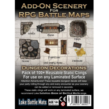 Attention Adventurers! These reusable Dungeon Decals will keep your party rolling through any and every encounter as your adventure can be personalised in seconds! These static clings will work on any laminated RPG map to instantly add doors, furniture, treasure, traps and many more details!